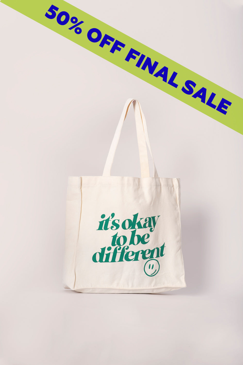 Tote bag made from cotton canvas with silk-screen print in front. No zipper on opening.