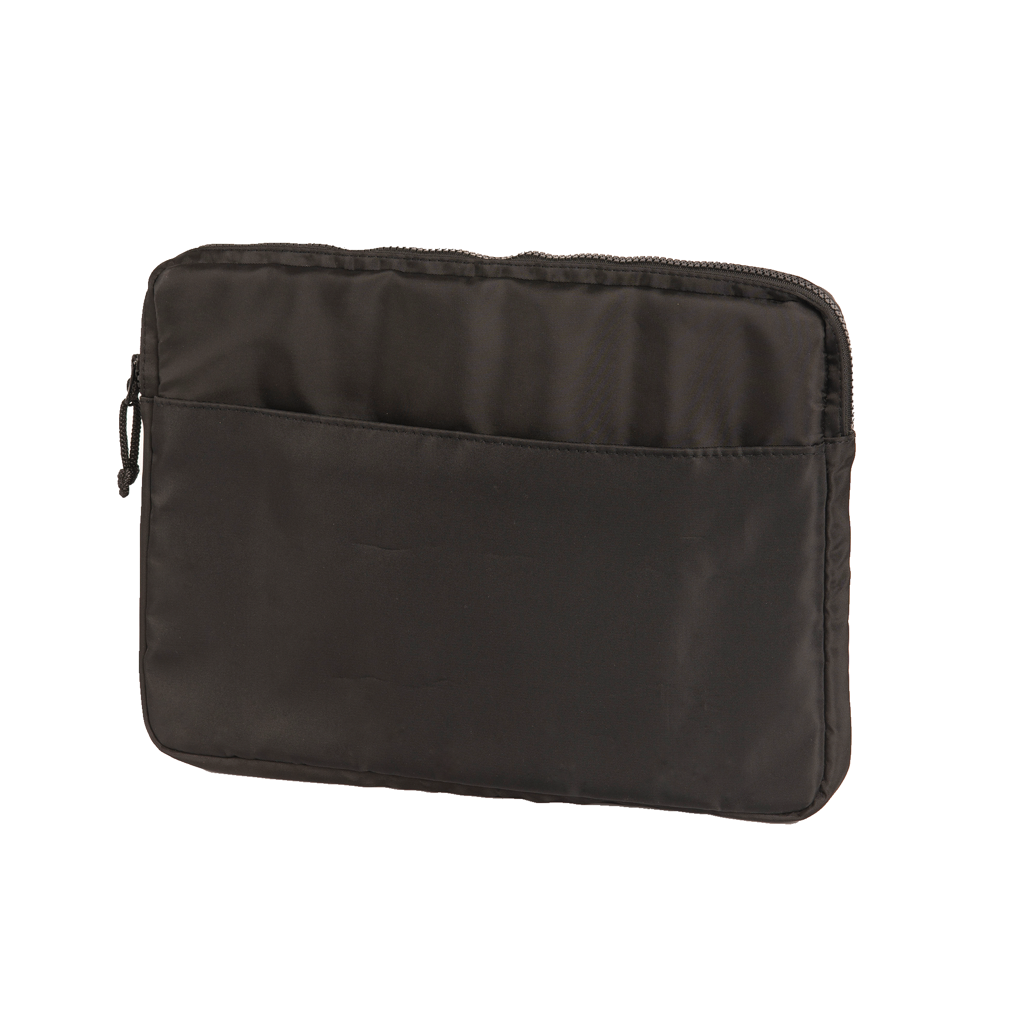 A Laptop sleeve made from black nylon textile with water resistant lining. Main compartment with plastic zipper closure. One outside open pocket. Can fit up to a 14" laptop