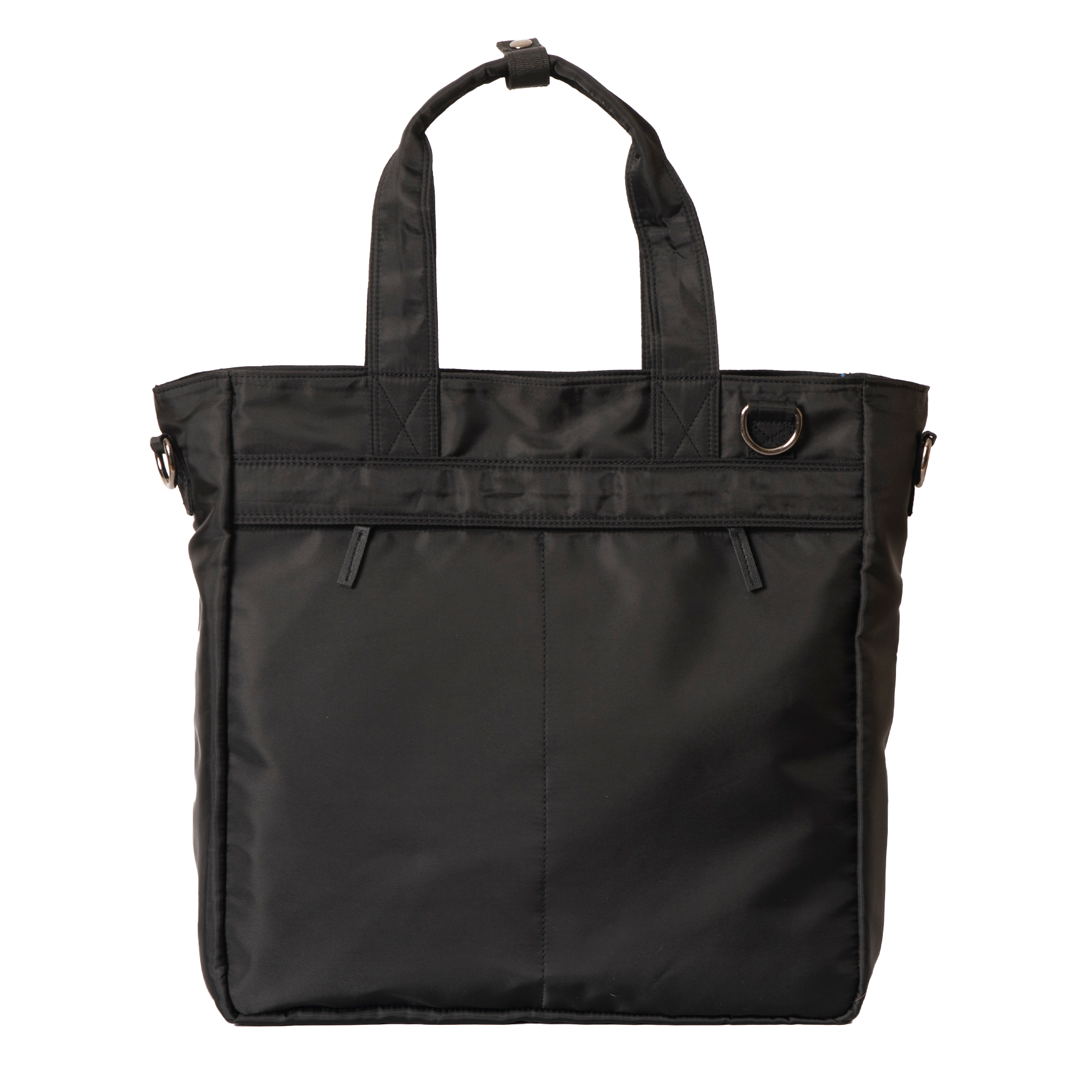Utility bag made from black nylon textile with black manufactured leather details and water resistant lining. Main compartment with reverse zipper closure, inside zipped pocket, and an internal 13" inch laptop sleeve (can fit most 14" laptop) with pen inserts and two open pockets. Comes with handles with snap lock and detachable sling strap. Two front zipped compartments. Back open compartment with zipped bottom for luggage handle insert.