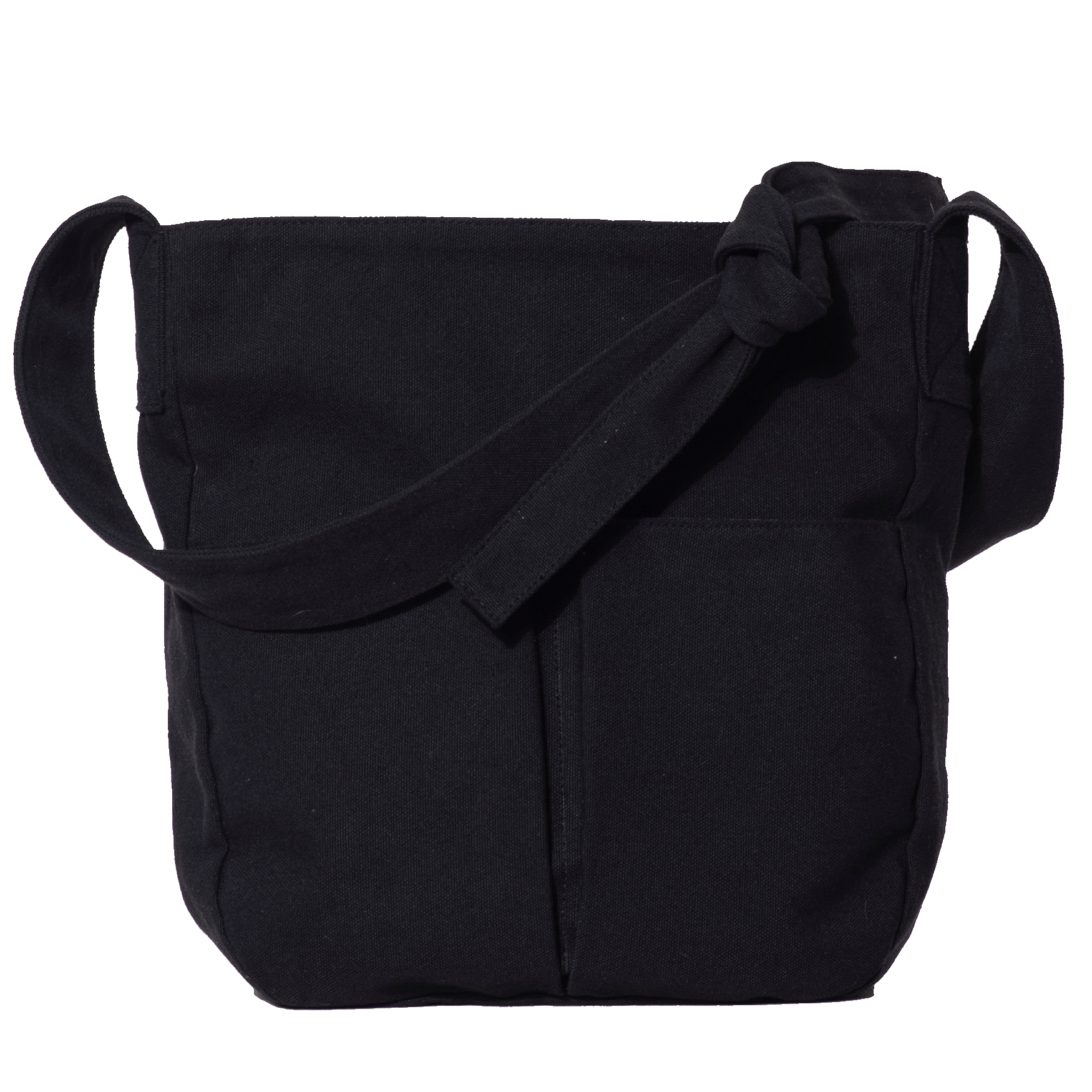 A multi-use bag that transforms from a tote bag to a crossbody messenger with a knot.