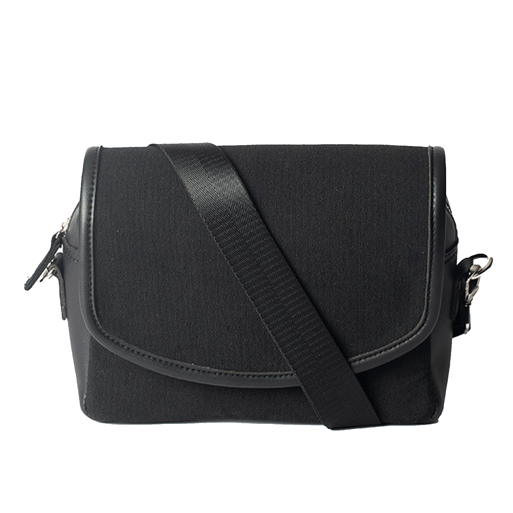 Crossbody bag made from manufactured leather and thick canvas with silver color metal hardware. Main closure is a canvas flap with magnetic closure. Main compartment with metal zipper and metal puller closure with one zipped inside pocket and four (4) card slots on the opposite side. Crossbody face with front zipped pocket. Open back pocket for extra storage Lined with black water-resistant fabric.