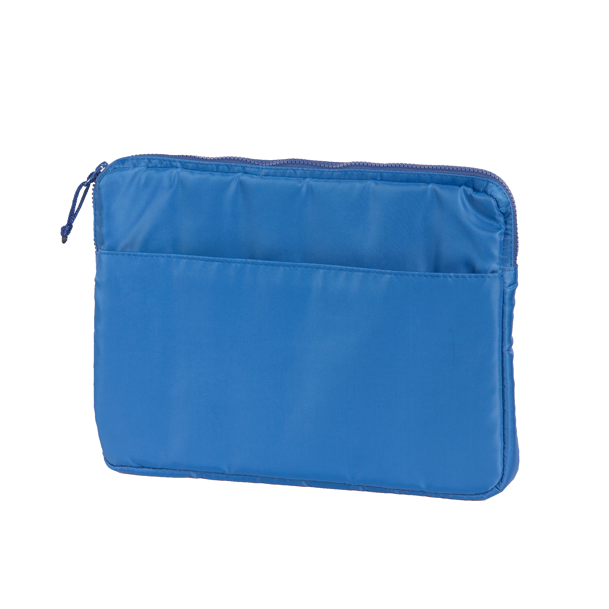 A Laptop sleeve made from black nylon textile with water resistant lining. Main compartment with plastic zipper closure. One outside open pocket. Can fit up to a 14" laptop
