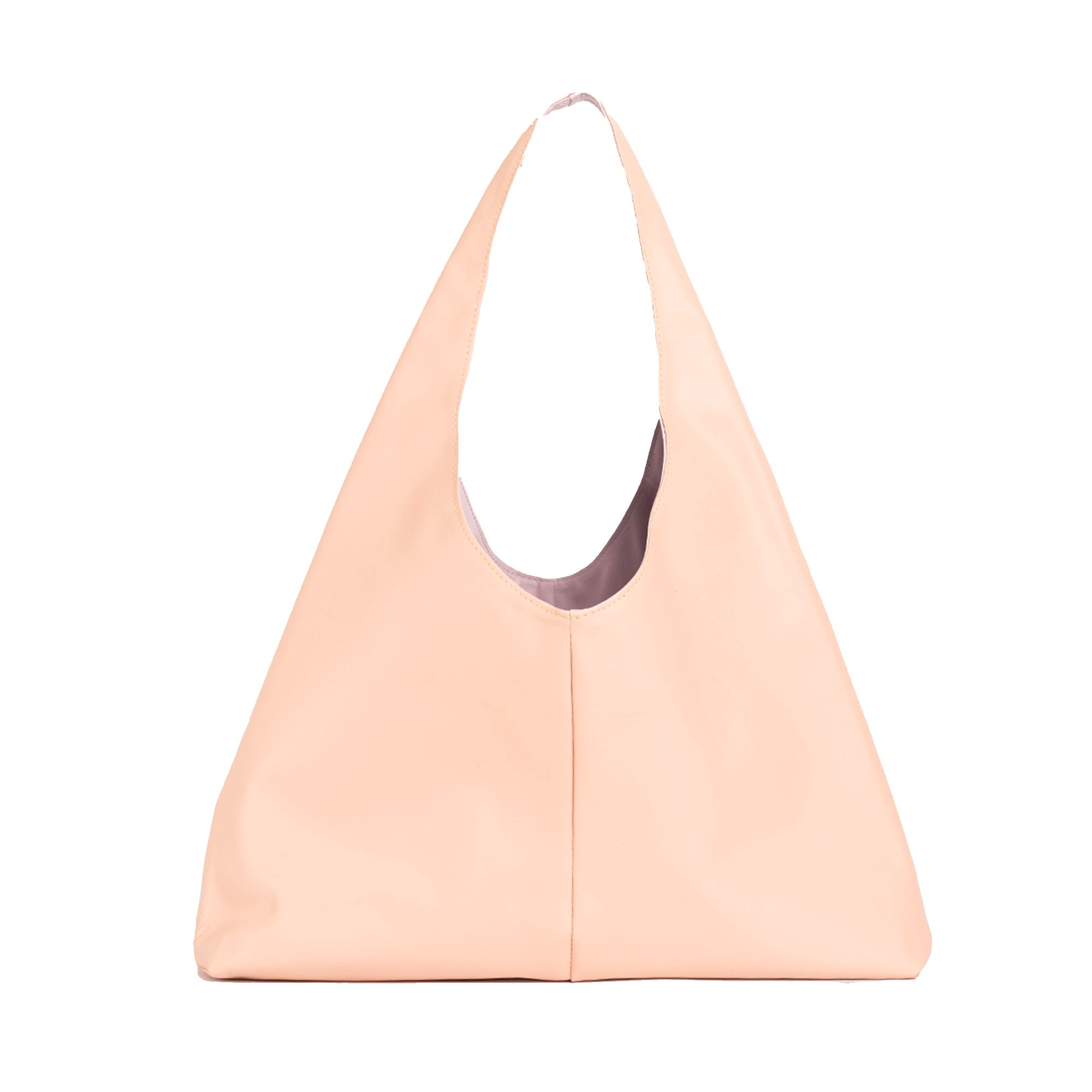 Reversible tote bag made from manufactured soft leather. One main compartment. One side is soft pink while the other side is lilac. With debossed Zero Gravity signature logo.