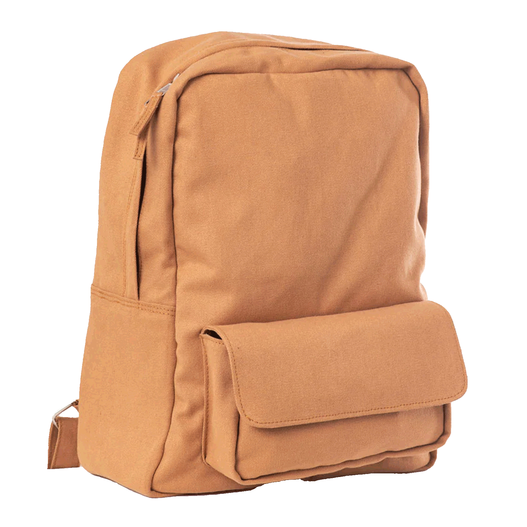 Backpack made from cotton canvas textile. Zipper opening with two pullers. Main compartment with zipper pocket and slot that can fit a 13” laptop. One front pocket with hook and loop (velcro) closure. Adjustable straps with foam lining. Beige poly-cotton lining. Silver hardware.