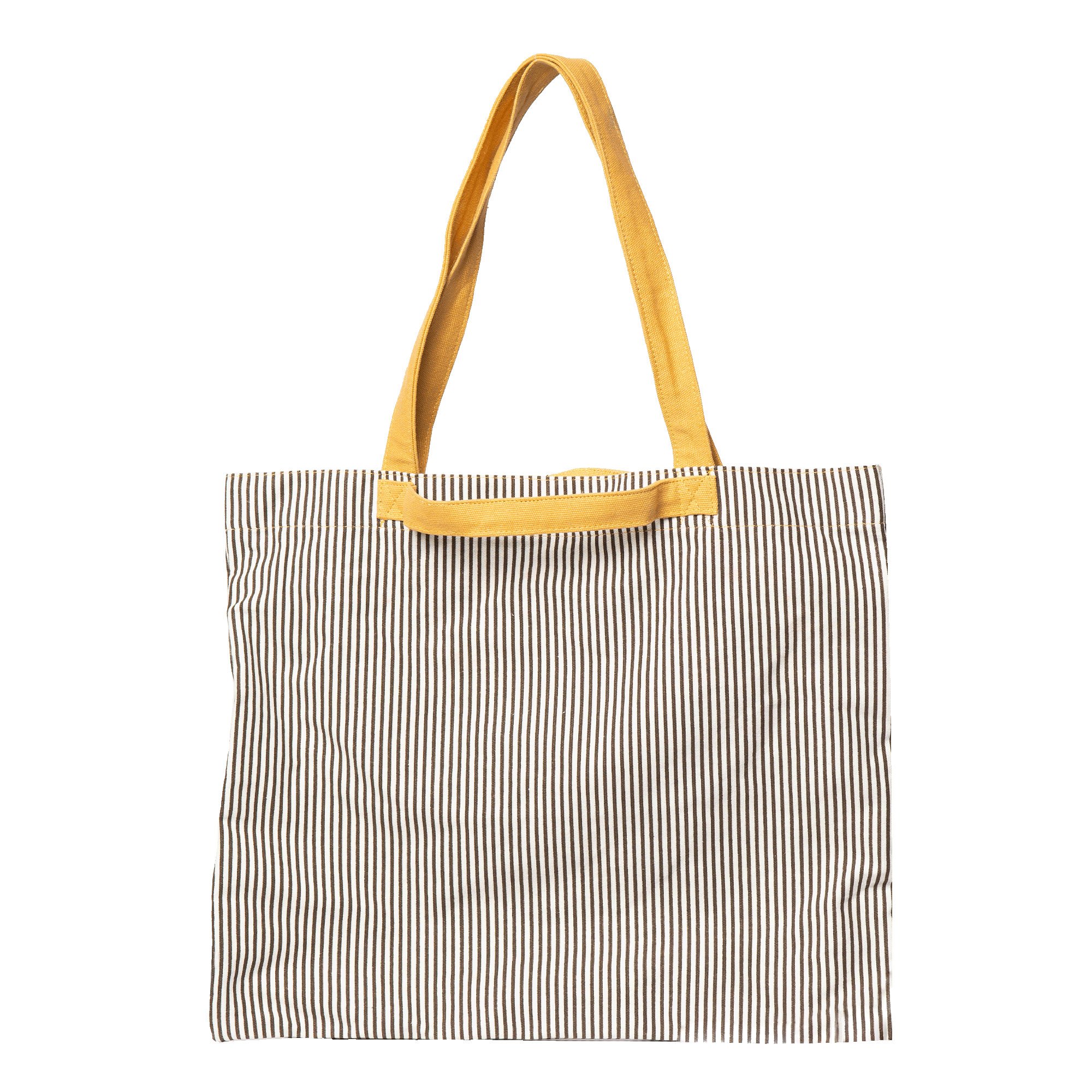 Tote bag made from brown striped cotton canvas with contrasting mustard straps. One small inside zipped compartment with two small open pockets sewn on top. With magnetic closure for the main compartment. One long shoulder strap and one short carry strap.