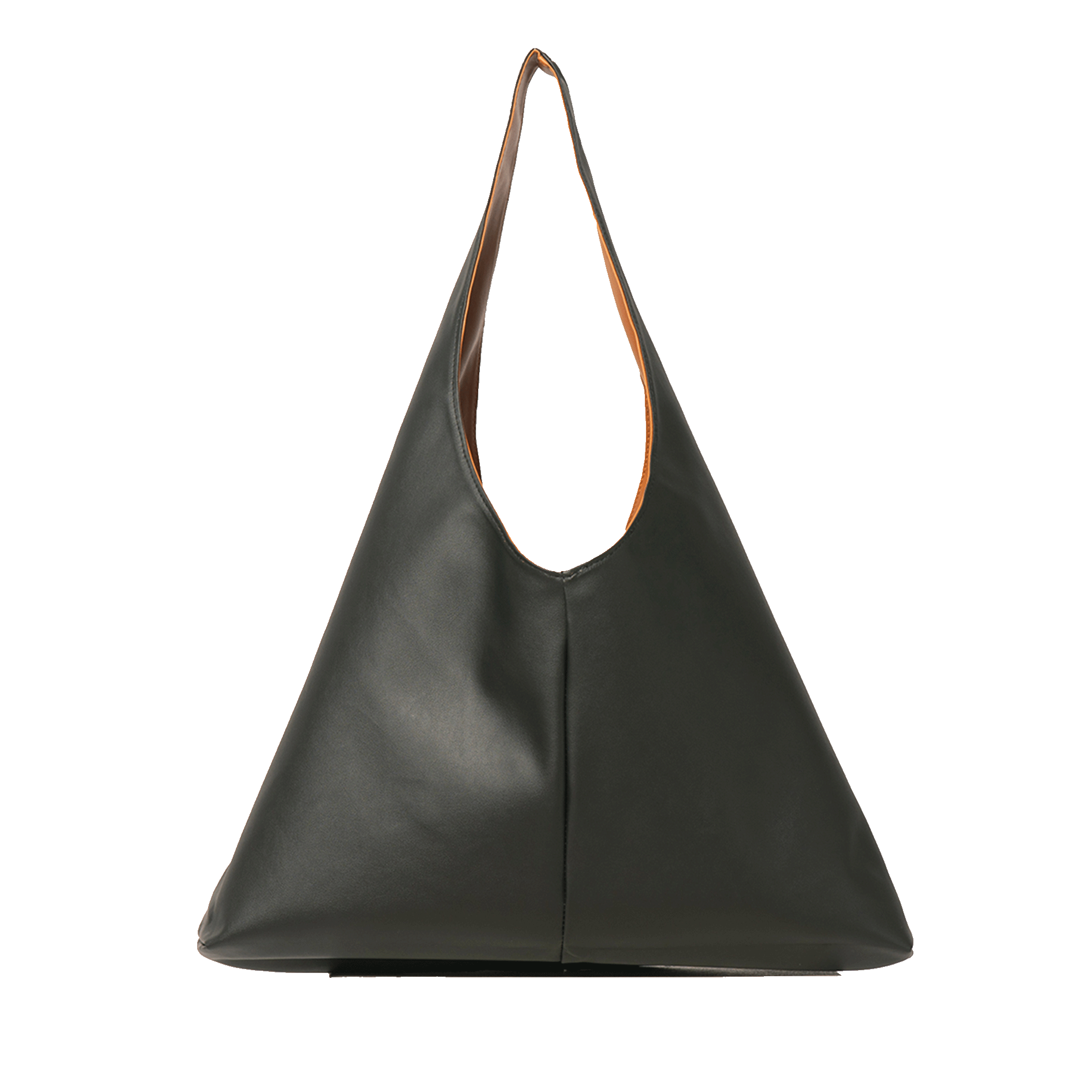 Reversible tote bag made from manufactured soft leather. One main compartment. One side is black while the other side is tan. With debossed Zero Gravity signature logo.