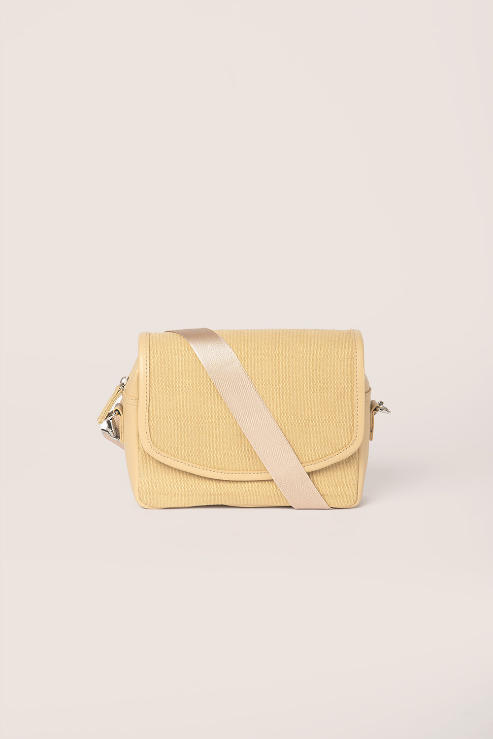 Crossbody bag made from manufactured leather and thick canvas with silver color metal hardware. Main closure is a canvas flap with magnetic closure. Main compartment with metal zipper and metal puller closure with one zipped inside pocket and four (4) card slots on the opposite side. Crossbody face with front zipped pocket. Open back pocket for extra storage Lined with black water-resistant fabric.