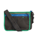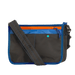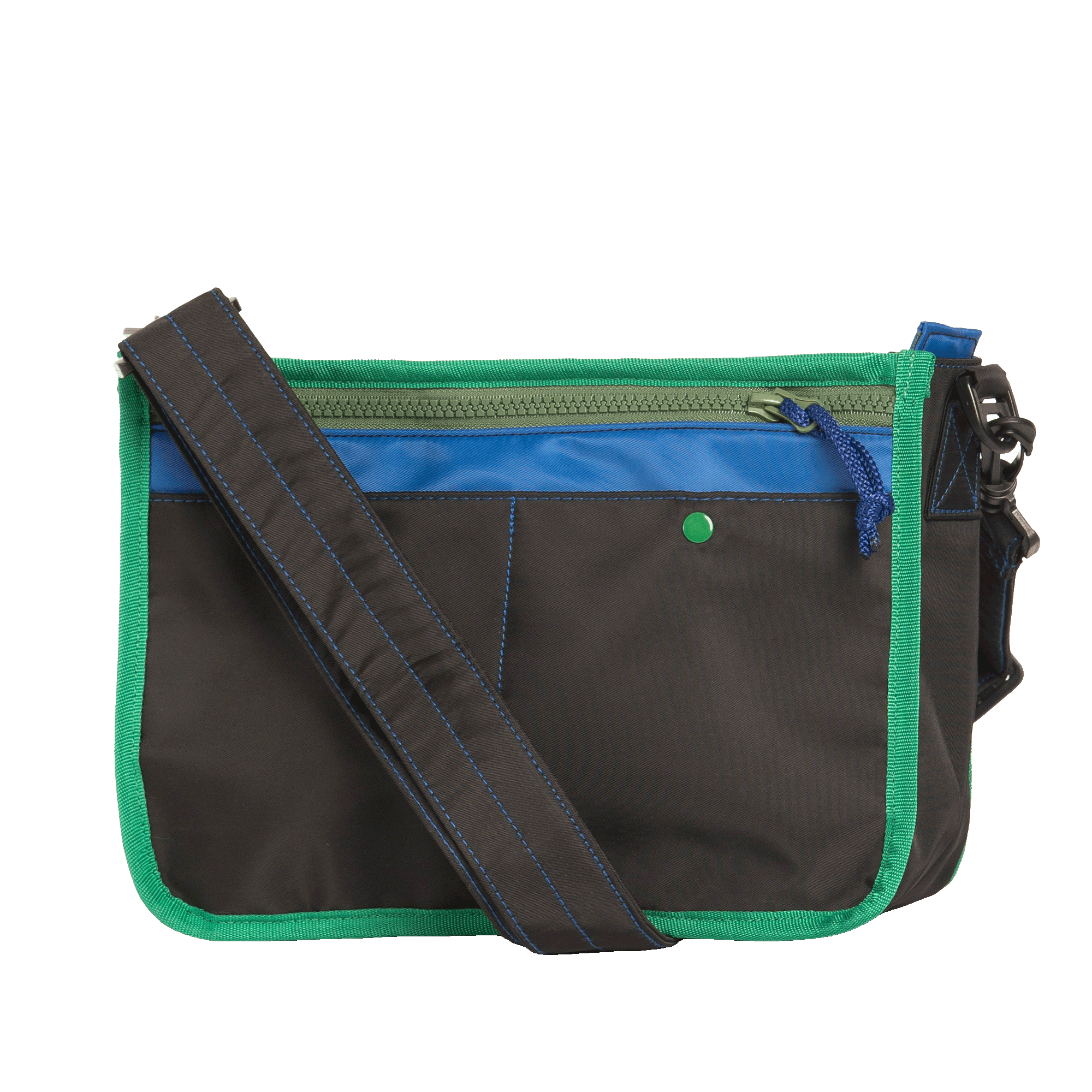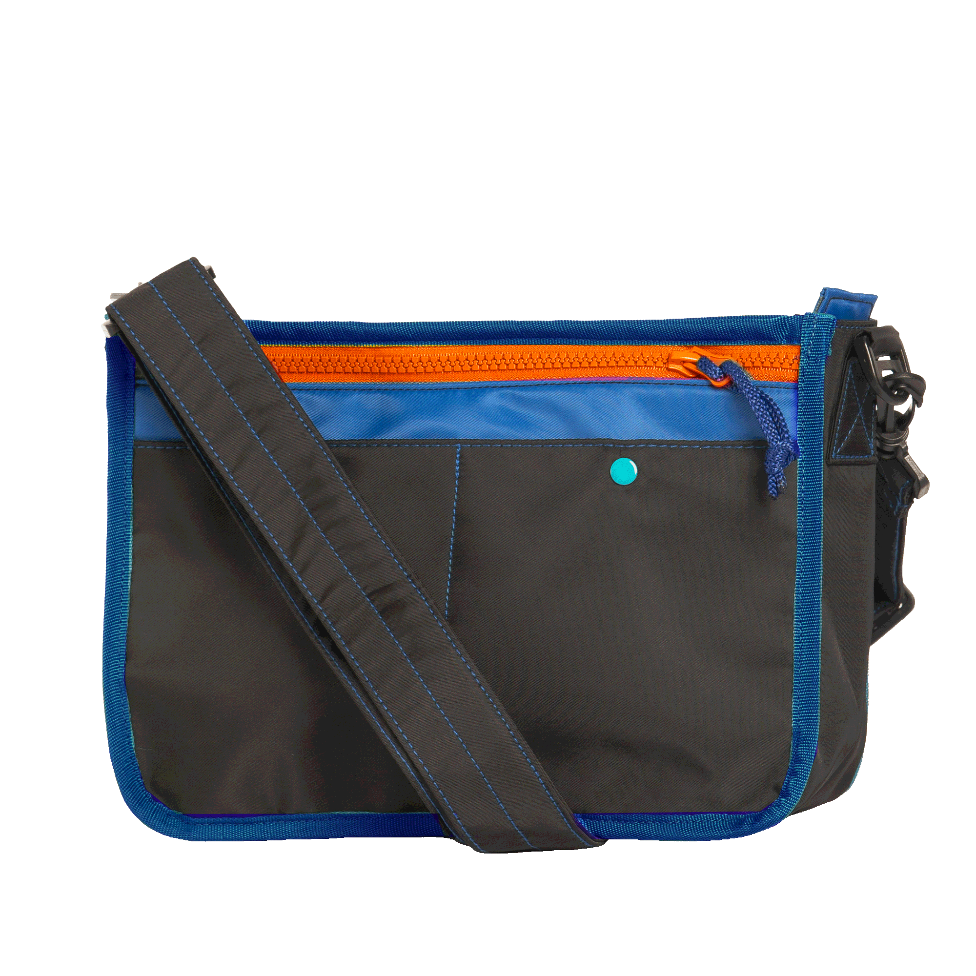 Crossbody bag made from mixed color nylon fabric. Main compartment with plastic zipper and nylon puller closure. Crossbody face with front zipped pocket and two snap closure open pockets. Open back pocket with snap closure for extra storage lined with blue water-resistant fabric.