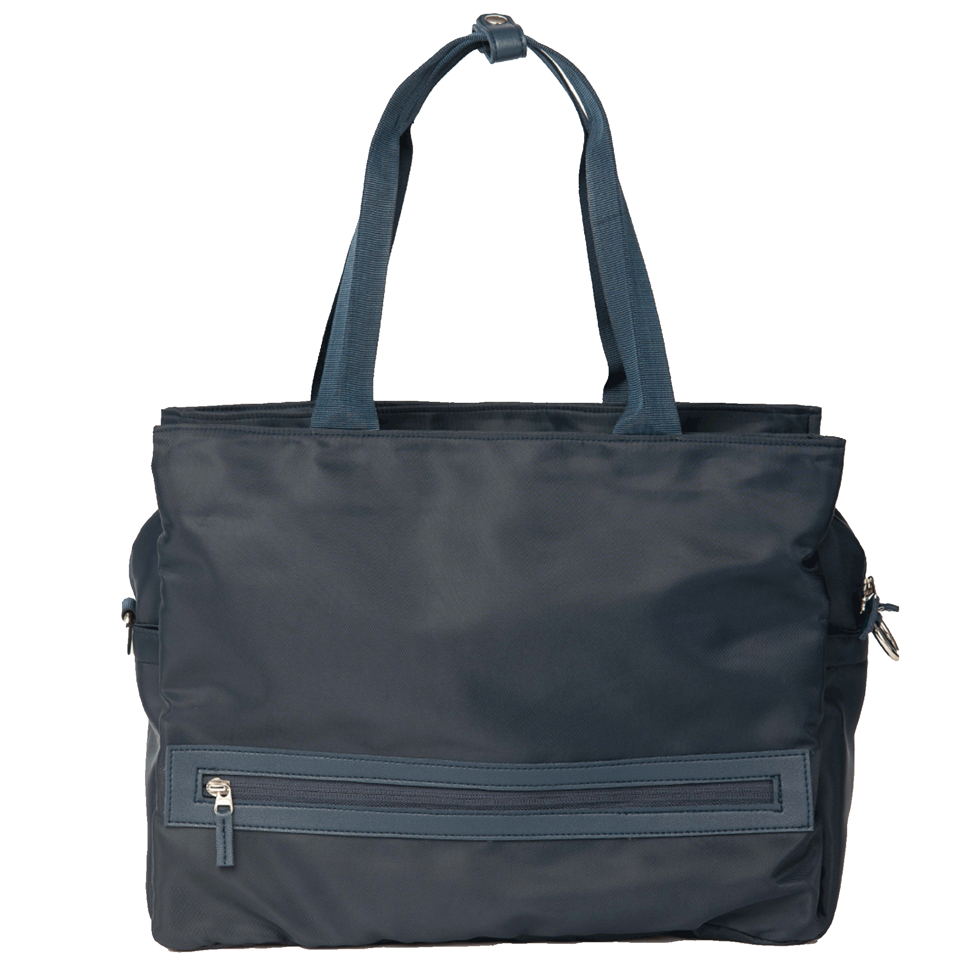 Utility bag made from black nylon textile with black manufactured leather details and water resistant lining. Main compartment with reverse zipper closure, inside zipped pocket, and an internal 13" inch laptop sleeve (can fit most 14" laptop). Comes with long handles with snap lock and detachable sling. Two side compartments with hook-and-loop closure. One of the side compartments with two accessory pockets and two ball-pen holders. Front zipper accent with manufactured leather border.