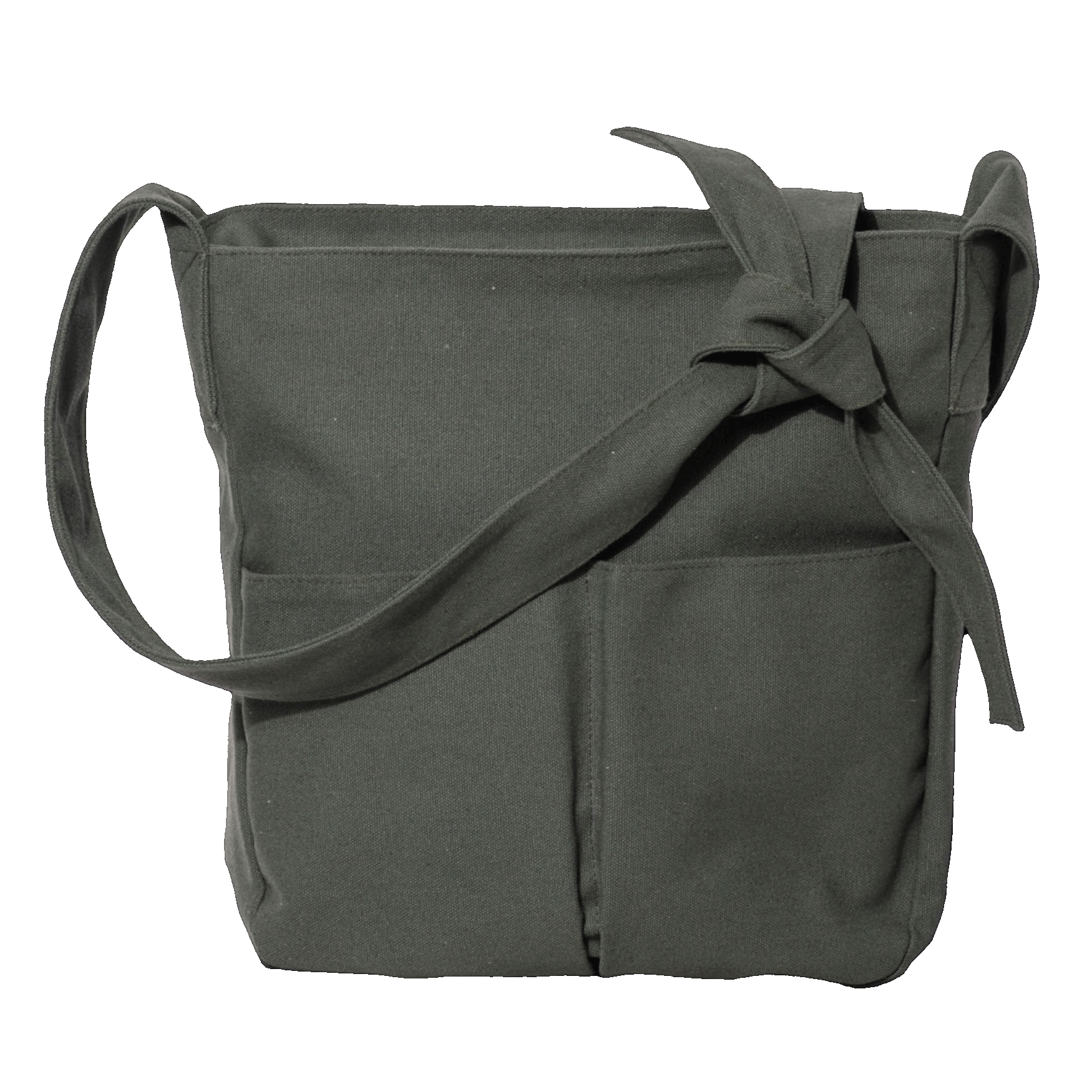 A multi-use bag that transforms from a tote bag to a crossbody messenger with a knot.