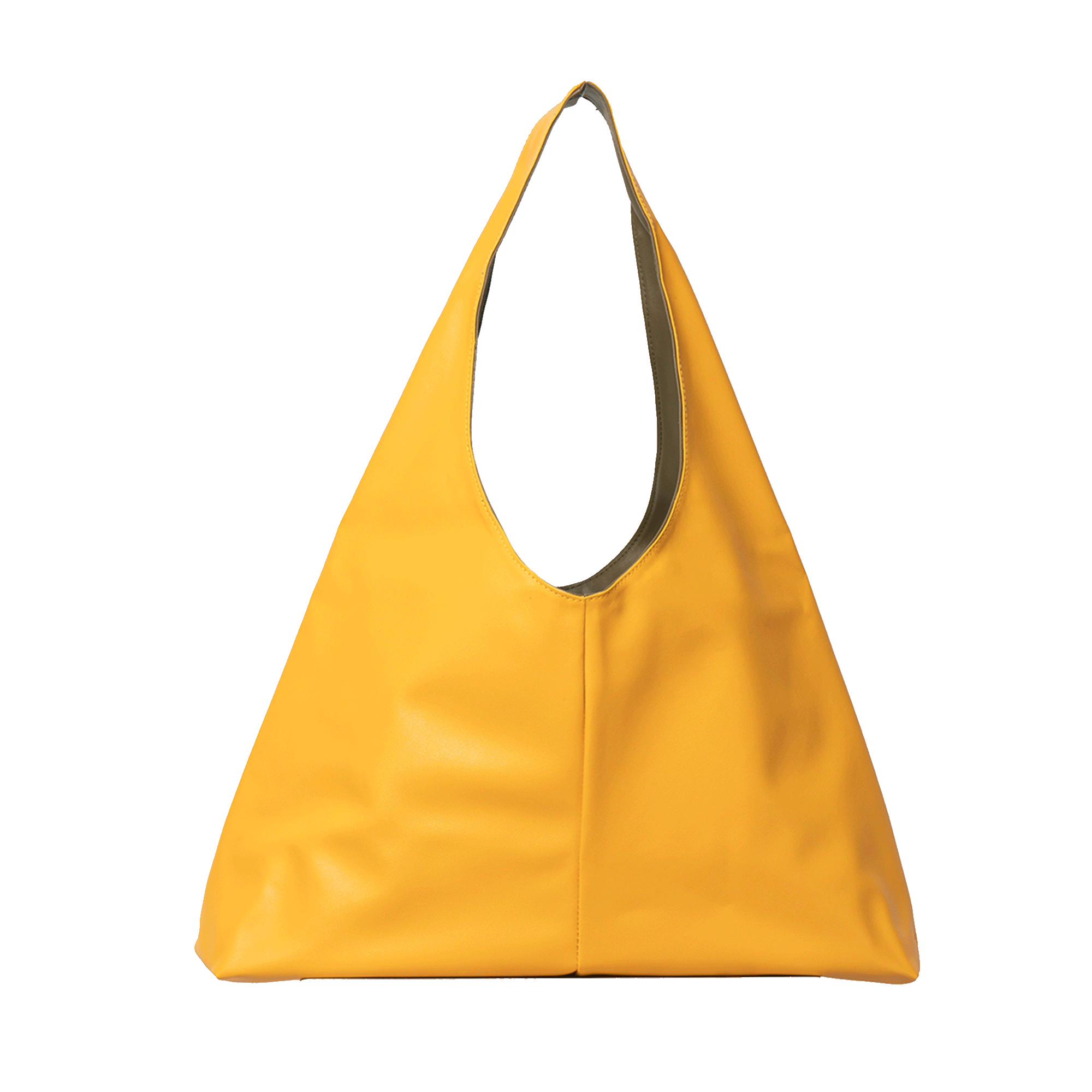 Reversible tote bag made from manufactured soft leather. One main compartment. One side is olive green while the other side is yellow. With debossed Zero Gravity signature logo.