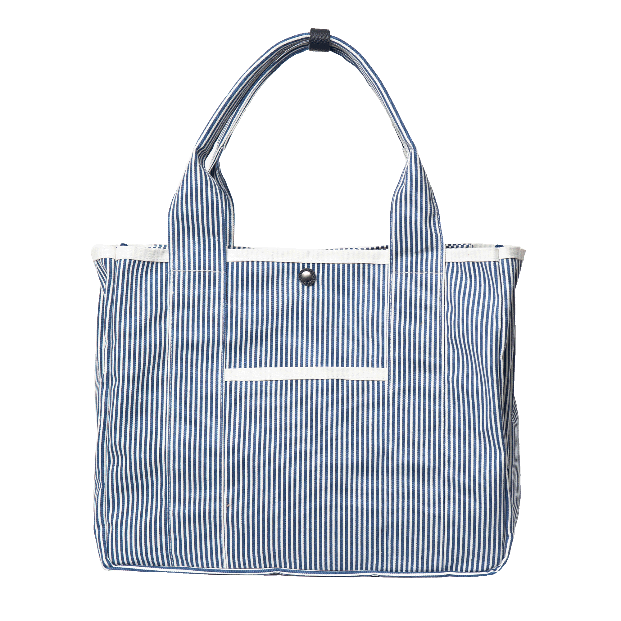 Tote bag made from black denim fabric with contrast white stitching. Two compartments with snap closure on both sides with the front compartment's snap having a genuine leather backing for support. Back side with an extended cover fabric with three snap closures. Front side with open pocket for accessories. Front compartment with open pocket with woven Zero Gravity logo . Top handle can be fastened with the genuine leather snap closure strap.  Base: 16" x 7"Height: 13.5"Handle drop: 9.25"