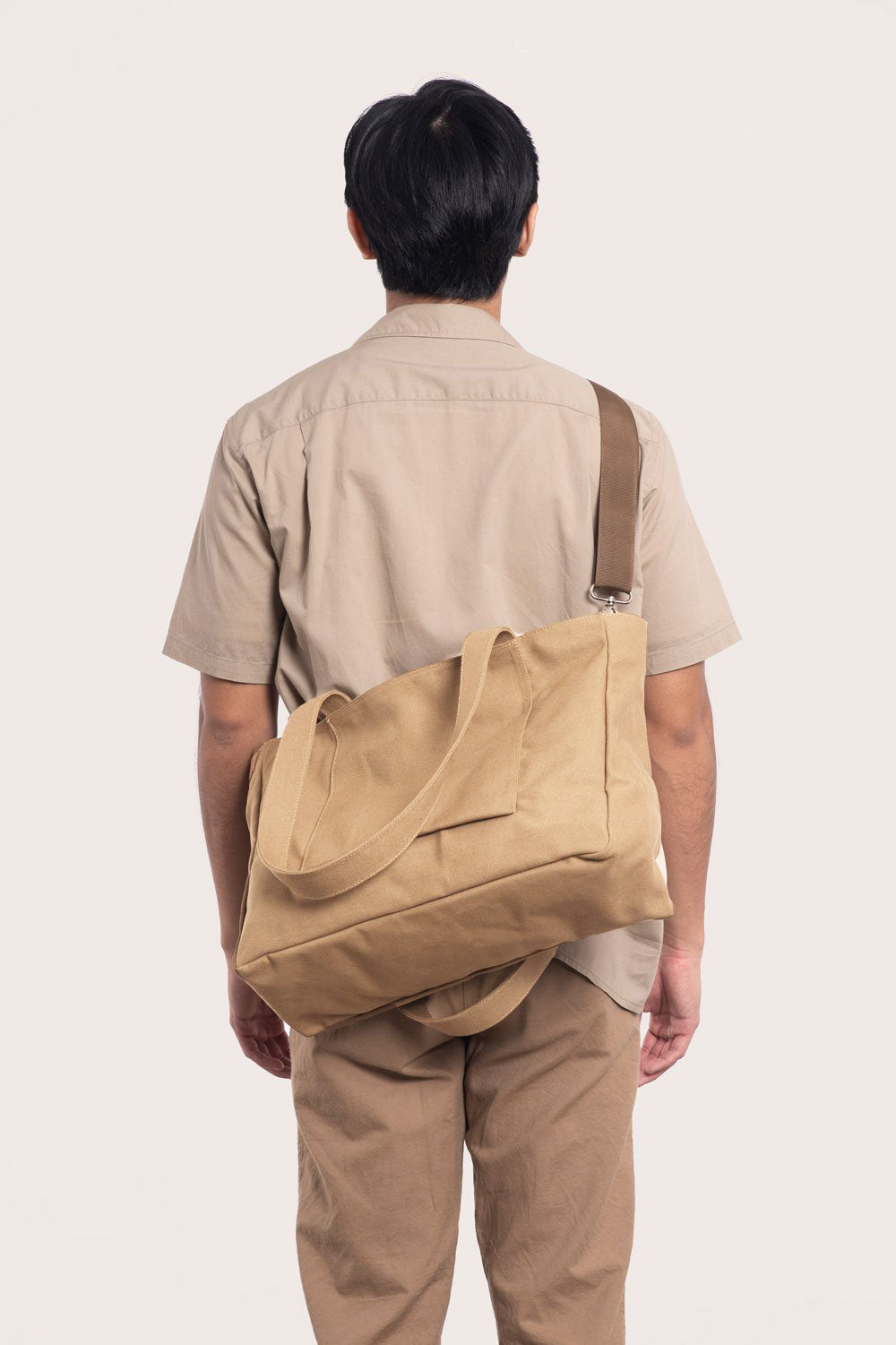 Tote bag made from thick cotton canvas with two open front and back pockets. Main compartment with zipped closure. One inside pocket for accessories. Two metal d-ring hooks for straps.